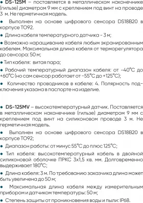 Температурный датчик совместим с терморегуляторами серии ТР-04.х, ТР-08.х.