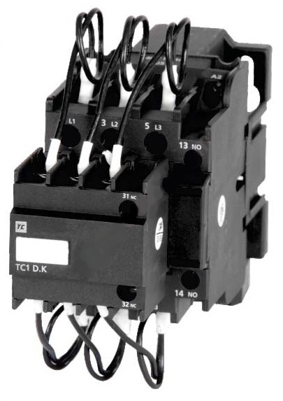 Контактор CS Electric 50 кВАр TC1D50K11M5 производства Индия, предназначен для коммутации конденсаторов в компенсаторных установках. Контактор защищает конденсатор от скачка тока при включении, на них уже установлены блок контактов опережающего включения и токоограничивающие резисторы, управляются автоматическими регуляторами КРМ. Производятся в диапазоне коммутируемого напряжения от 240В до 690В, мощностью до 70 кВАр.
