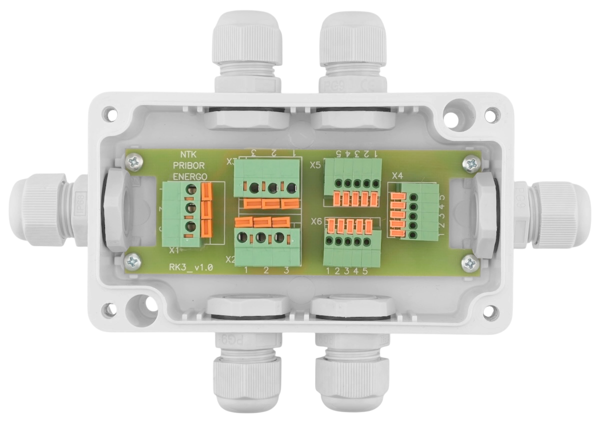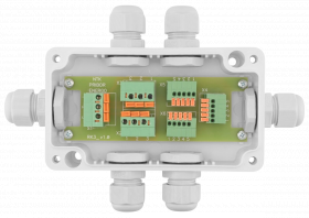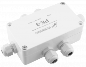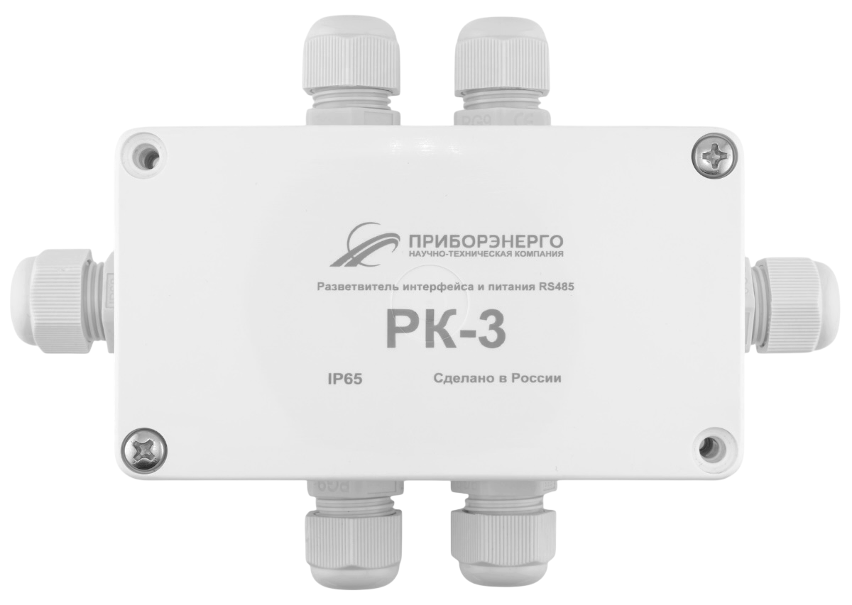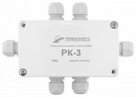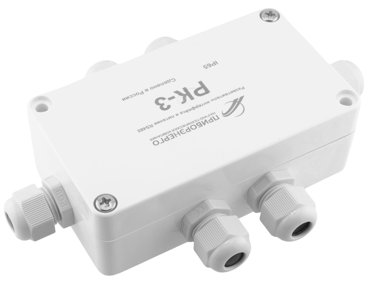 Разветвитель РК-3 относится к классу пассивных разветвителей интерфейса RS-422/485 и питания и представляет собой присоединительно-согласующее устройство приемников и передатчиков сигналов интерфейса RS-422/485. Корпус изготовлен из термостойкого поликарбоната. Герметичные кабельные вводы позволяют использовать кабели диаметром от 2 до 8 мм.