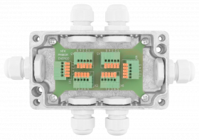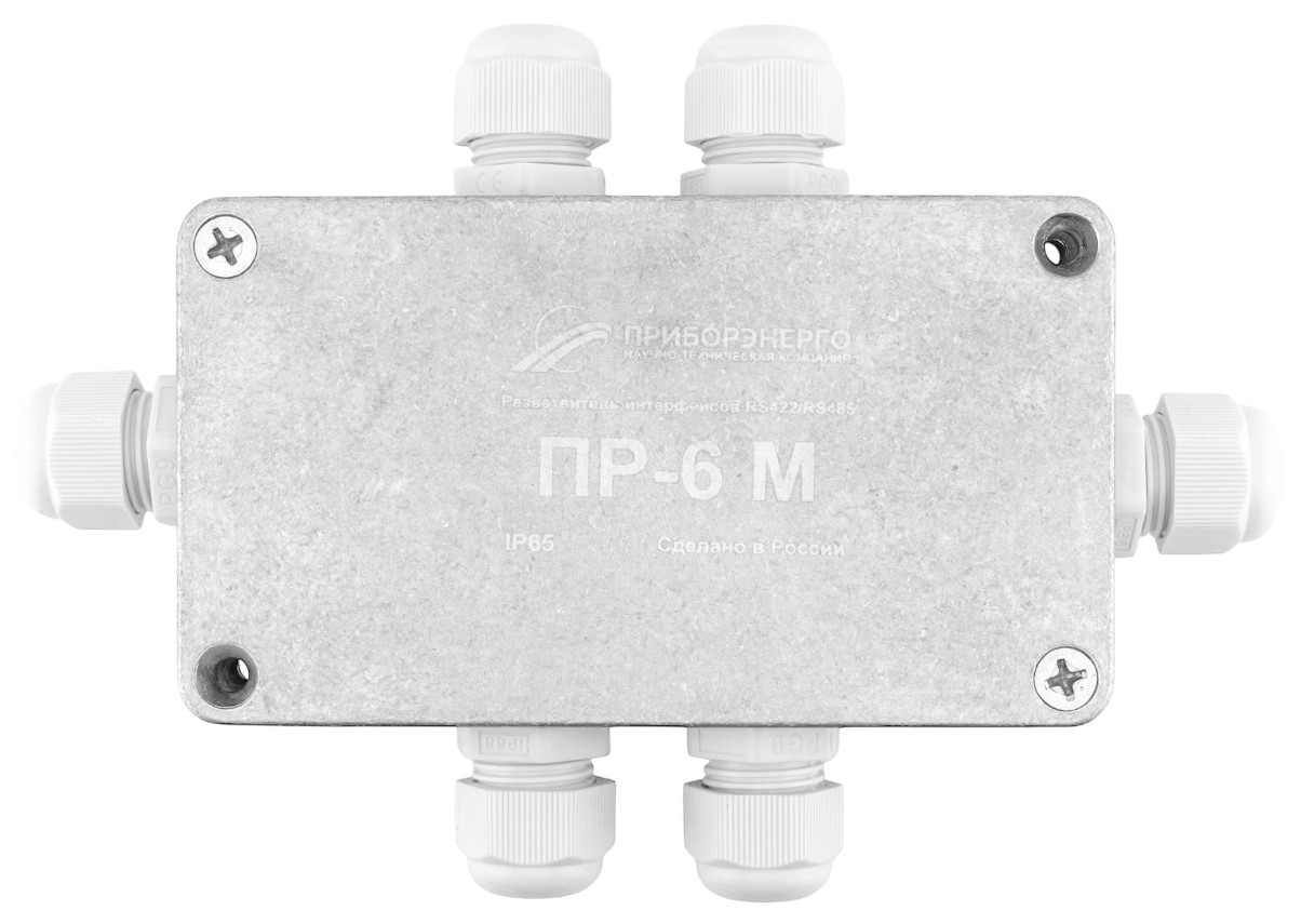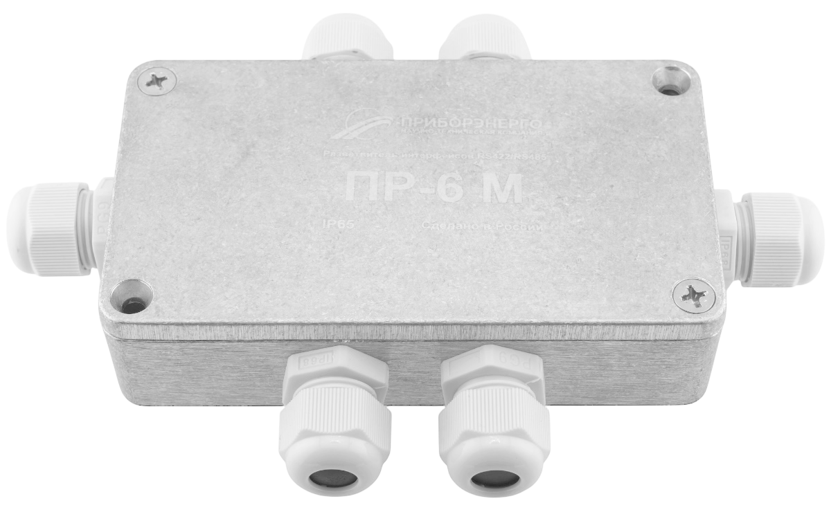 Разветвитель ПР-6М относится к классу пассивных разветвителей интерфейса RS-422/485 и представляет собой присоединительно-согласующее устройство приемников и передатчиков сигналов интерфейса RS-422/485. Корпус изготовлен из алюминиевого сплава ADC-12. Герметичные кабельные вводы позволяют использовать кабели диаметром от 2 до 8 мм.