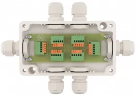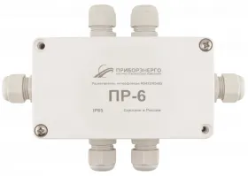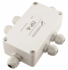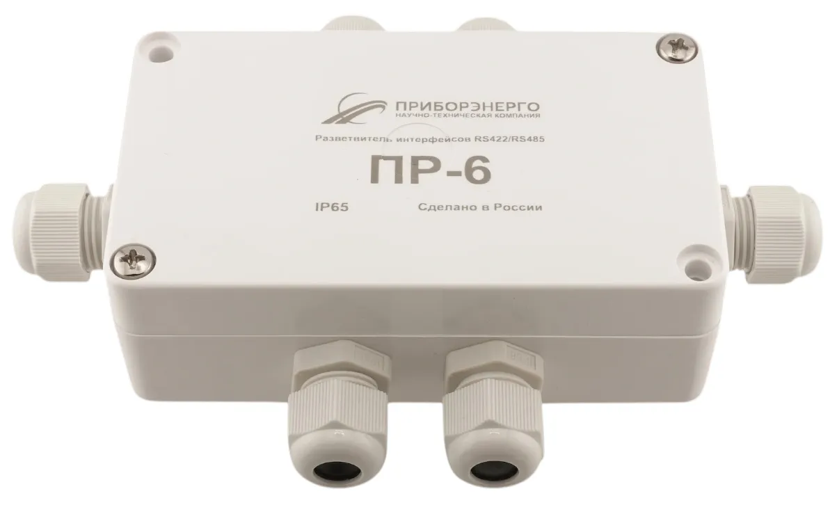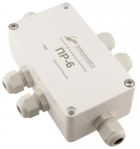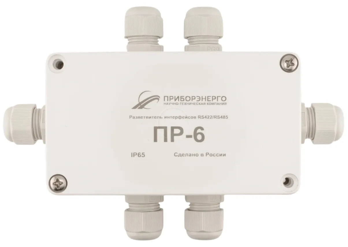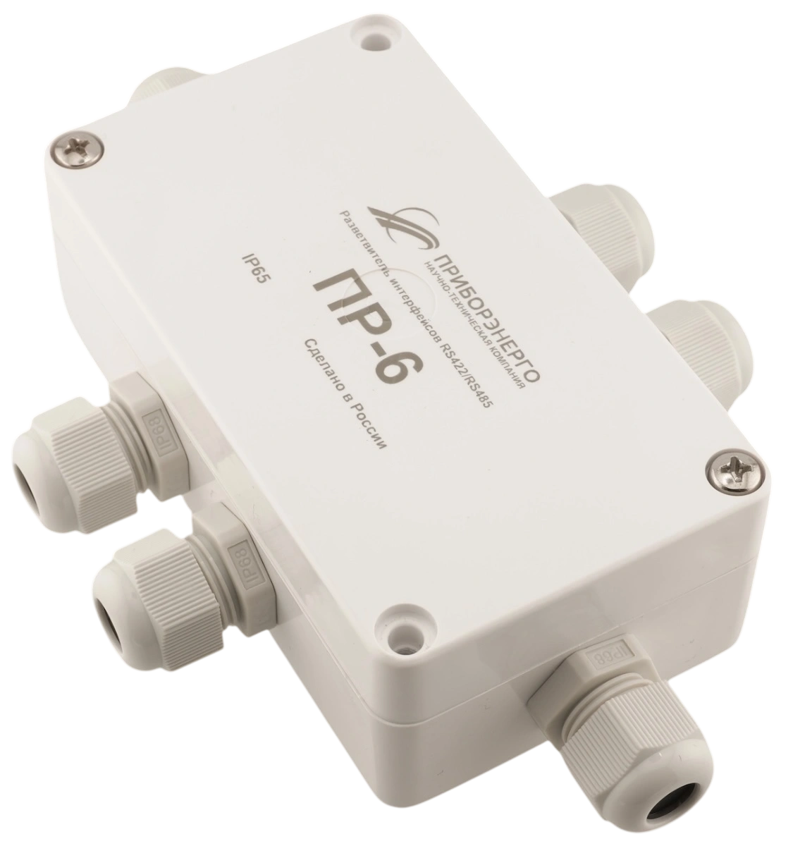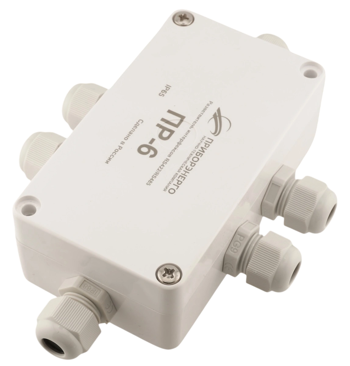 Разветвитель ПР-6 IP65 (Исполнение 1) относится к классу пассивных разветвителей интерфейса RS-422/485 и представляет собой присоединительно- согласующее устройство приемников и передатчиков сигналов интерфейса RS-422/485. Корпус изготовлен из самозатухающего АБС пластика. Герметичные кабельные вводы позволяют использовать кабели диаметром от 2 до 8 мм. Габаритные размеры устройства: не более 164 х 114 х 49.5 мм.