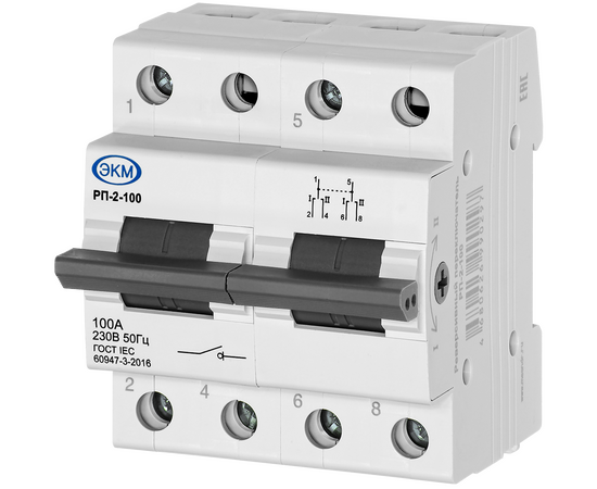 Реверсивные переключатель РП-2-100 арт. 4680626990297 применяется для ручного переключения нагрузки с одного ввода на другой и обратно, а также позволяет осуществлять оперативное управление участками электрических цепей.