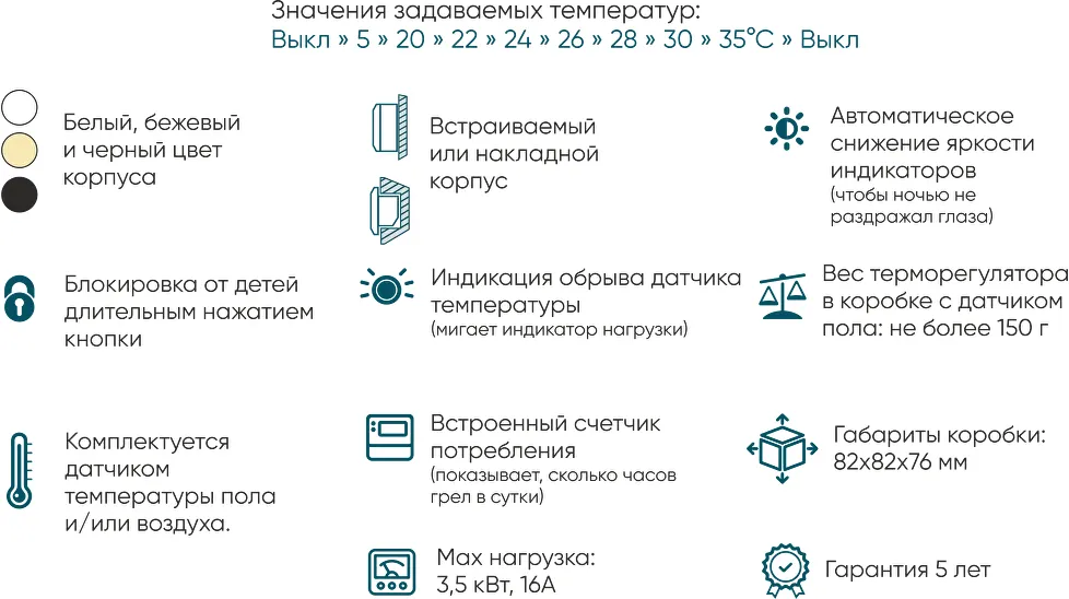 - Значения задаваемых температур: 5 - 20 - 22 - 24 - 26 - 28 - 30 - 35°С;