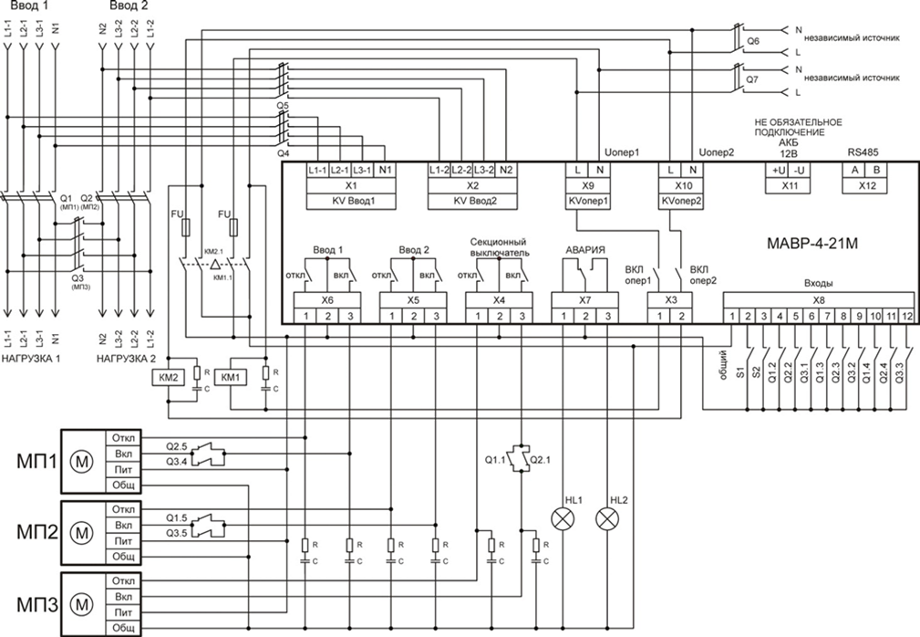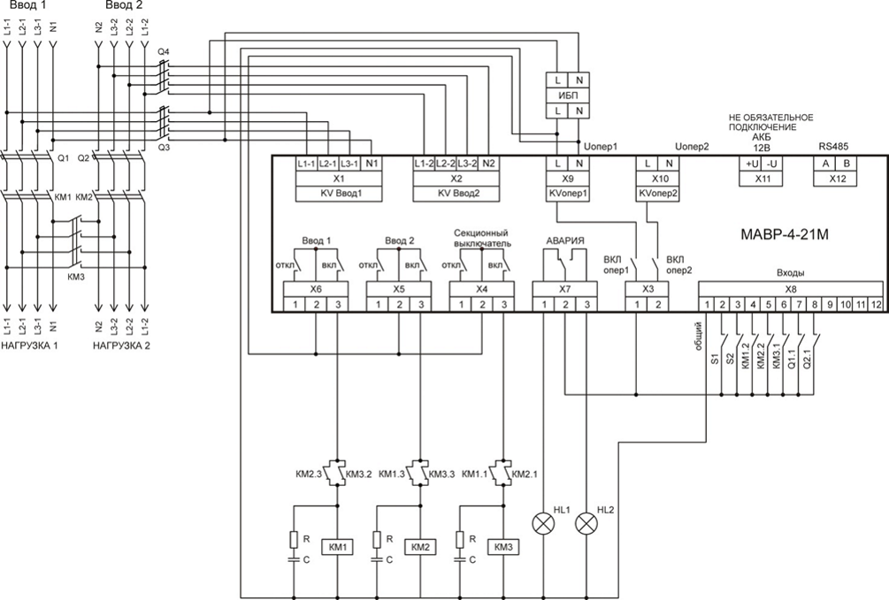 Модуль автоматического ввода резерва МАВР-4-21М (далее Устройство) предназначен для использования в схеме питания два ввода, две нагрузки с секционным выключателем. Устройствот управляет коммутационными механизмами для переключения нагрузок с основного источника питания на резервный с помощью секционного выключателя, при возникновении аварии на основном вводе, и возврат к исходной схеме питания при нормализации рабочих параметров основного источника питания. Управление коммутационными механизмами осуществляется в ручном или автоматическом режиме. В качестве коммутационных механизмов могут применяться электромагнитные контакторы или автоматические выключатели с моторприводом.