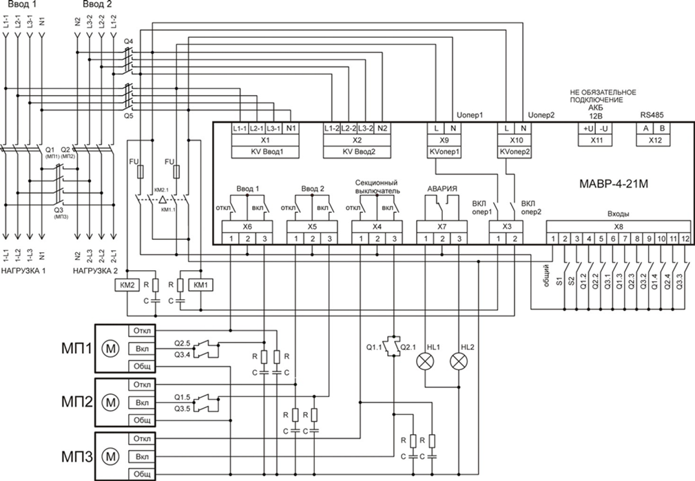 - ВВОД 1 – трехфазный, ВВОД 2 – трехфазный
