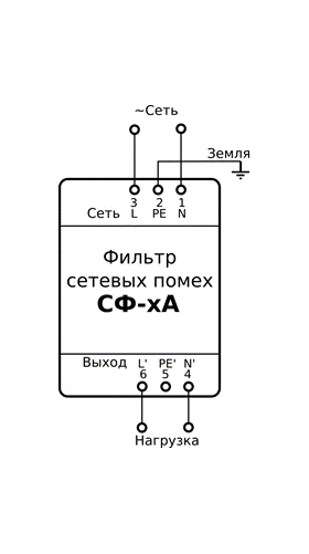 Фильтр включается в разрыв линии электропитания. Для присоединения к питающей сети и нагрузке фильтр имеет две группы винтовых клемм.