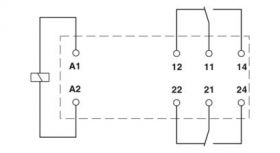Вставное миниатюрное реле, с силовым контактом, 2 переключающих контакта, кнопка для тестирования, механический индикатор коммутационного положения, статусный светодиод, диод свободного хода, полярность А1+, А2, входное напряжение 24 В DC