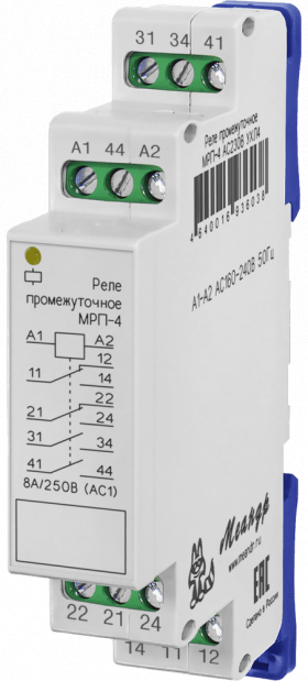 Промежуточное реле МРП-4-1 (далее устройство) предназначено для дистанционного включения нагрузки, гальванической развязки силовых цепей и цепей управления, увеличения количества переключаемых групп контактов..