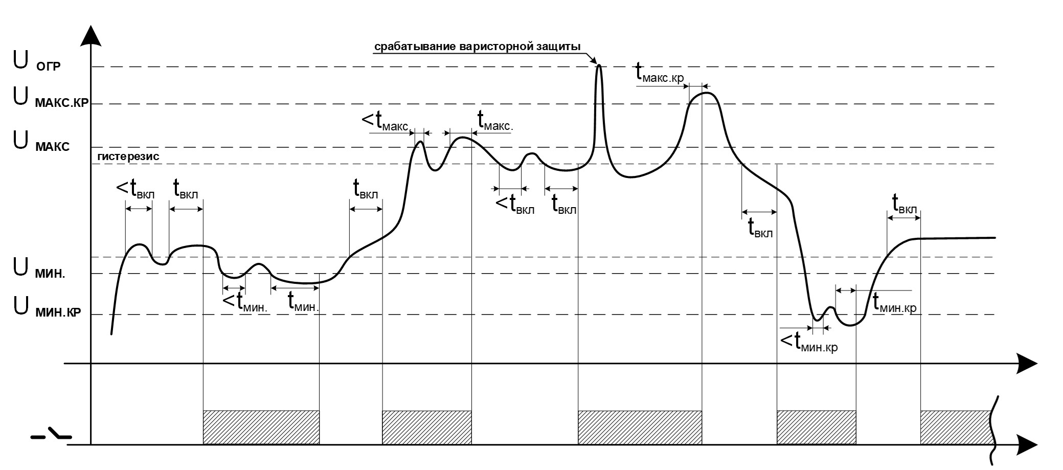 При выходе напряжения сети за установленные пороги срабатывания или при возникновении другой аварии, устройство отсчитывает задержку срабатывания. Если авария сохраняется дольше задержки срабатывания, произойдет отключение нагрузки от сети. После нормализации напряжения устройство начинает отсчет времени включения tвкл, по окончании которого произойдет подключение нагрузки. Если в процессе отсчета произойдёт аварийная ситуация, отсчет времени сбросится.